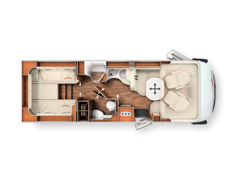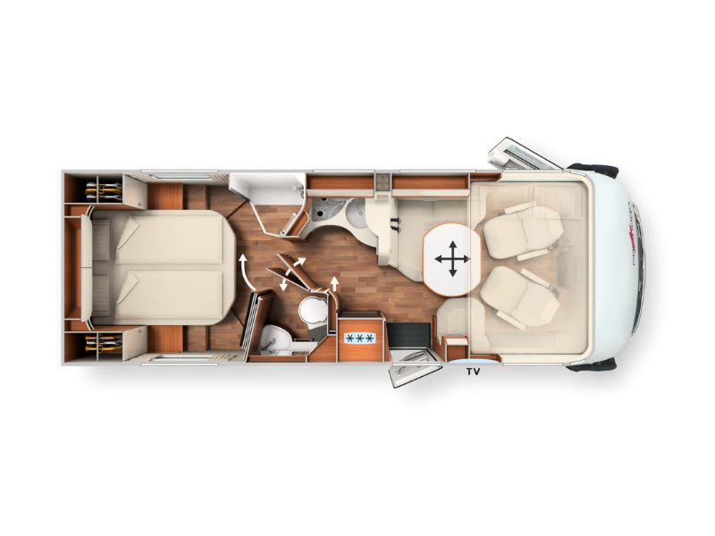 The furniture design impresses in the interior with its flowing lines and rounded, exclusive furniture surfaces. The living area of the motorhome scores points with a spacious L-shaped lounge seating area with ergonomically designed upholstery, a wide side seat bench and the 360° living area table. The comfort corner kitchen has six large drawers, an elevated kitchen work surface with designer bar cabinet as a visual room divider and an additional work surface, including a slide out storage cabinet. The bathroom of the A-class chic c-line provides maximum comfort and a completely separable changing room. The cosy fixed beds are equipped with the point elastic Carawinx sleeping system. The large, heated double floor with a usable height of up to 70 cm, which is easily accessible from both the outside and the inside, ensures that there is plenty of storage space in this motorhome.